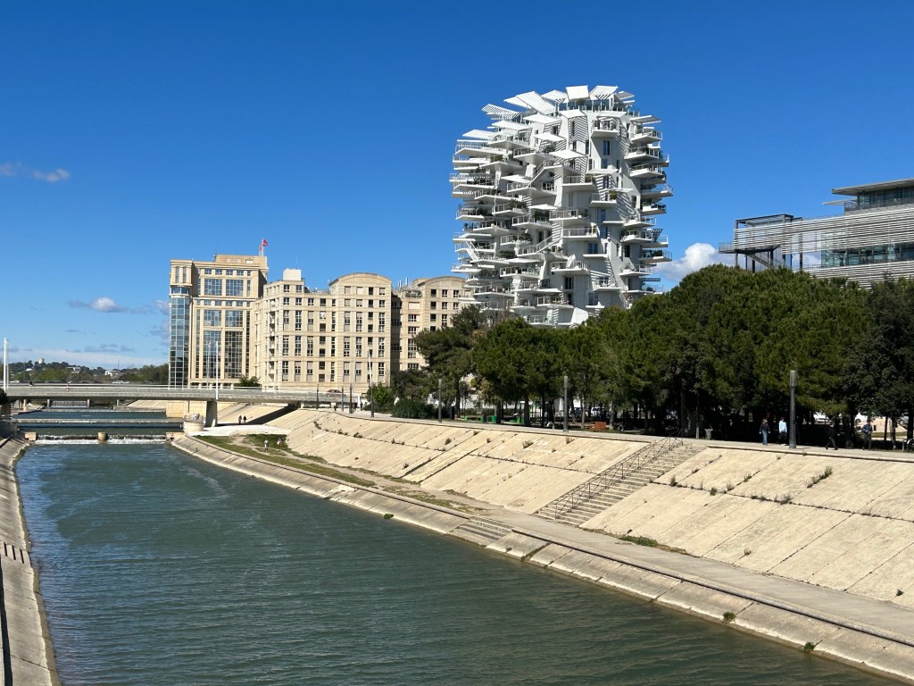 Puis c’est l’arrivée à Montpellier en suivant le Lez… le vent souffle de plus en plus fort : poubelles et scooters renversés, branchés qui tombent, il est temps de se mettre à l’abri chez Michelle qui le prête son appartement.