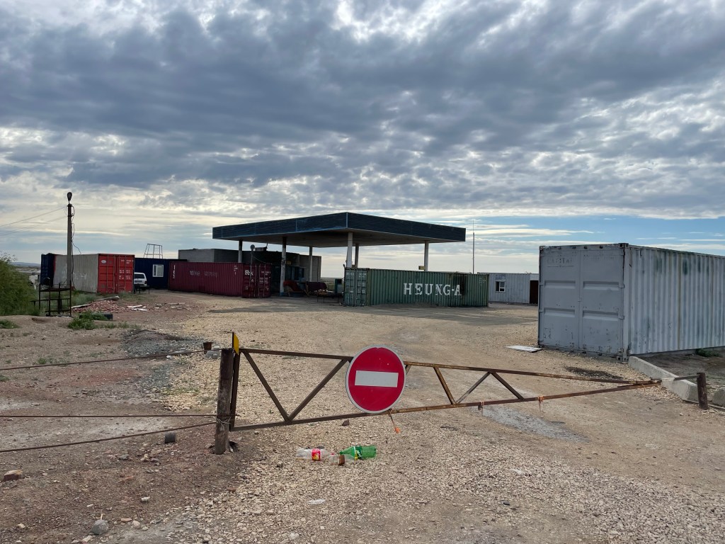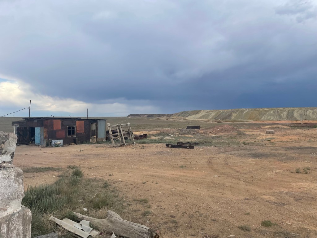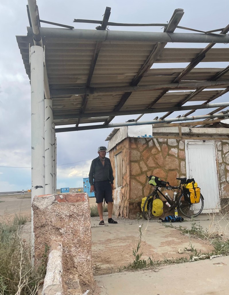 J’avais repéré quelques constructions 17 km avant Balkhash (j’en avais même fait l’arrivée de l’étape car en préparant mon voyage je ne me voyais pas faire une étape de plus de 150 km).
