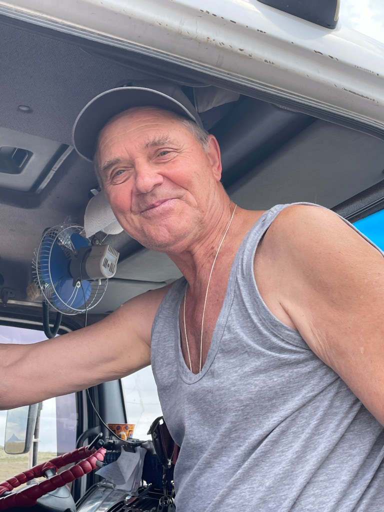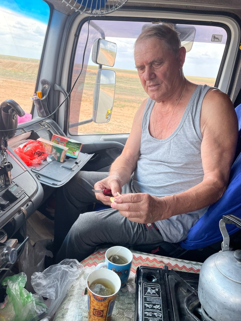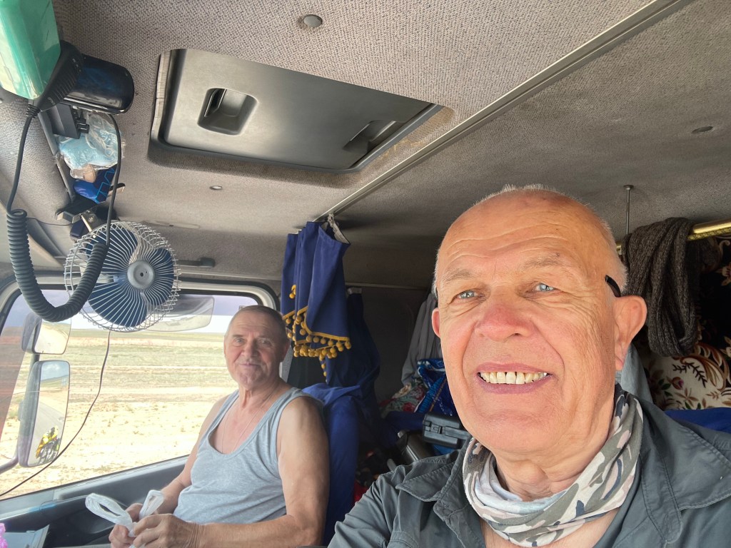 Il s’appelle Fionar, habite à Almaty et revient de Nur-Sultan. A 72 ans il fait toujours la route et sa cabine est aménagée pour en faire une seconde maison.