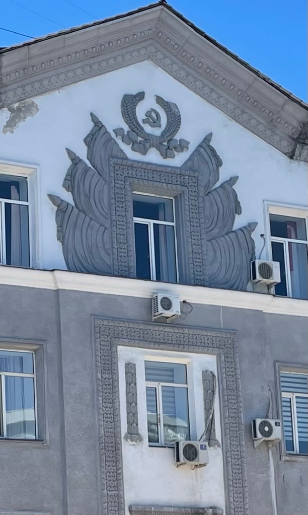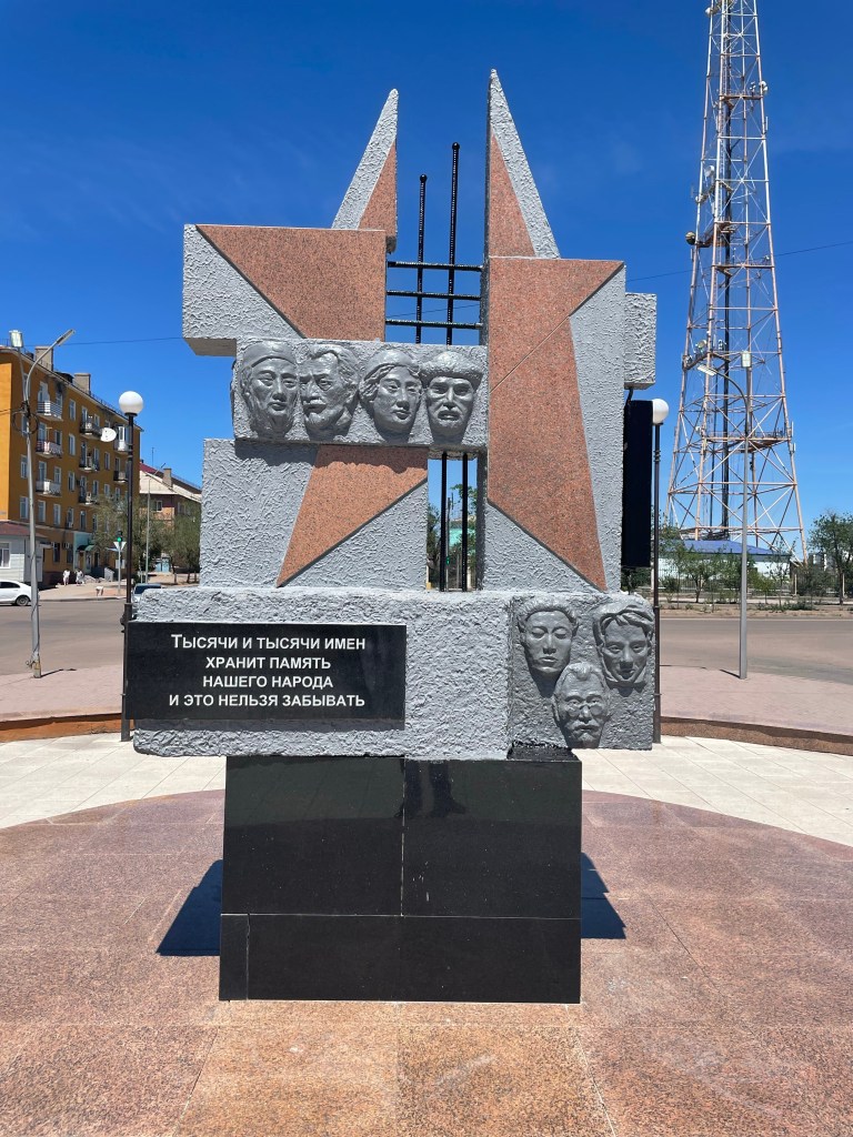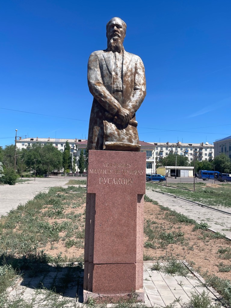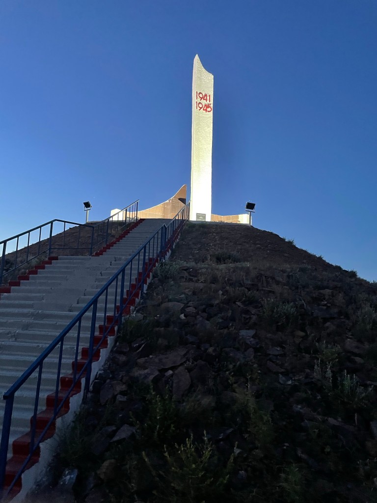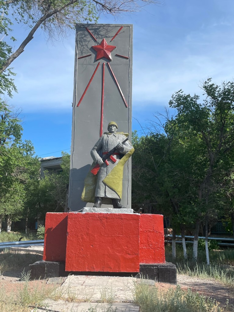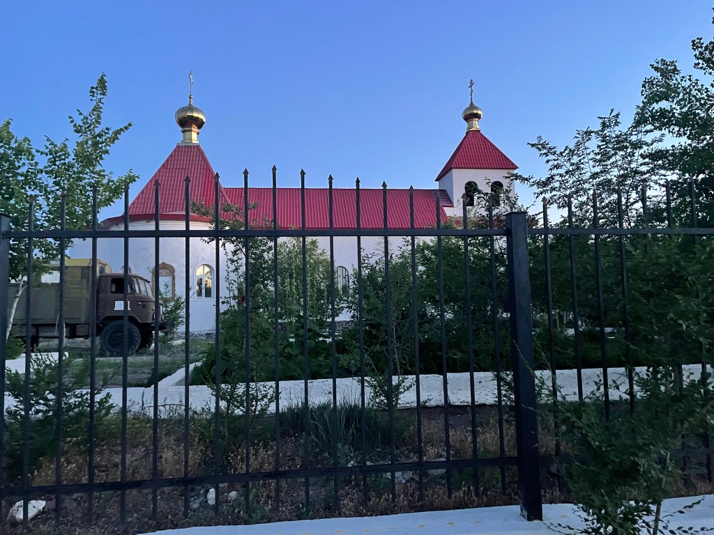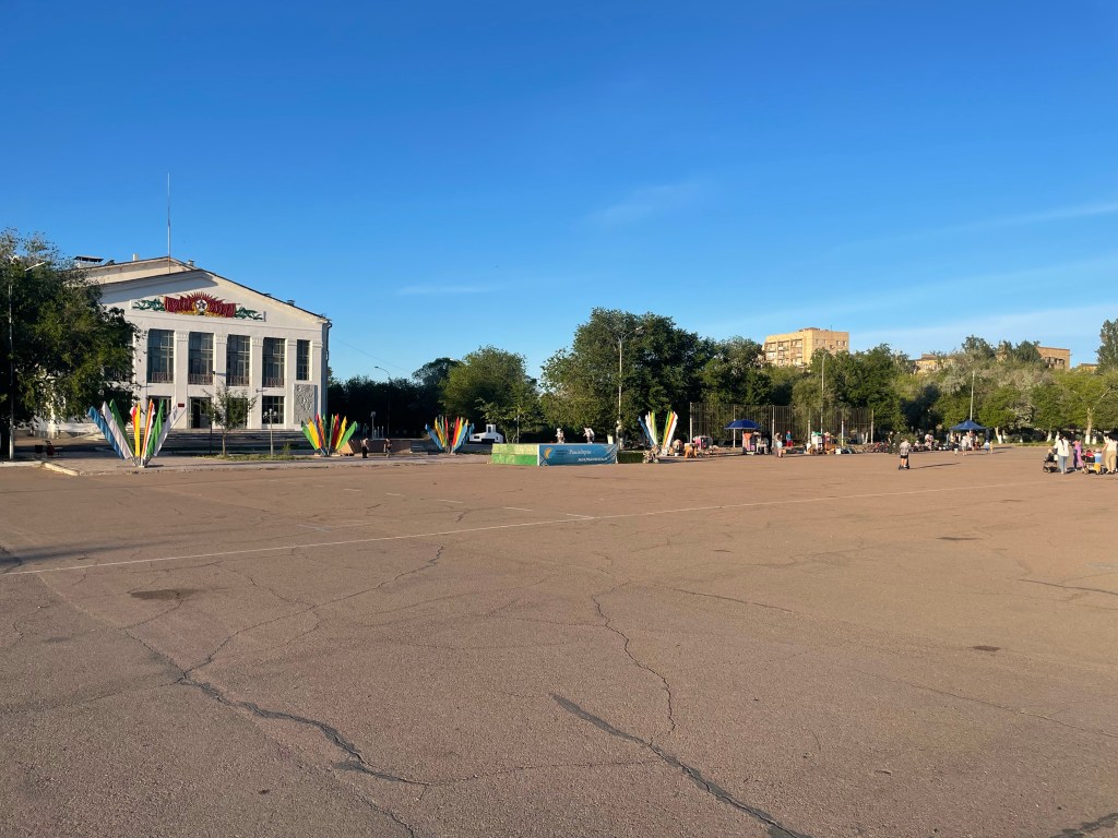 Place principale où les parents louent des petites voitures électriques aux enfantsProcurature C’est une ville militaire… sous l’égide de l’étoile rougeUne plage (en travaux…)Vue sur le lac depuis mon hôtel Supermarché central Une église orthodoxe (je prends la photo de l’extérieur pour ne pas risquer une négociation comme à Karaganda)Le monument à la gloire des héros de « la grande guerre patriotique »Coucher de soleil sur le lac Balkhash